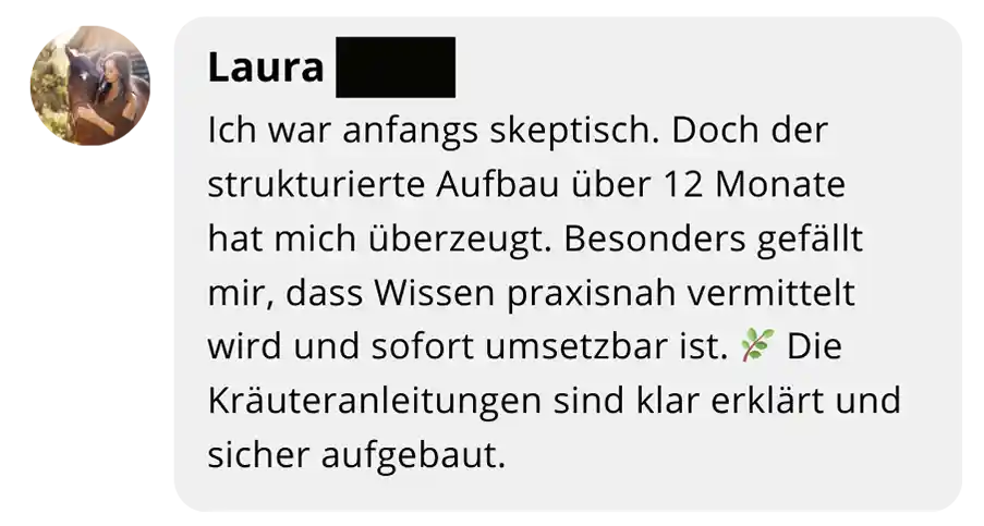 „Hier geht es nicht um reine Symptombekämpfung. Ich zeige dir, wie du dein Pferd ganzheitlich betrachtest und durch natürliche Heilmethoden sanft unterstützen kannst, wieder ins körperliche Gleichgewicht zu kommen.”